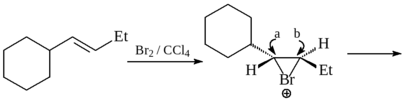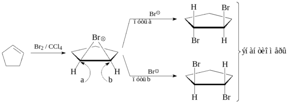5757. Схема бромирования циклопентена с образованием 1,2-дибромциклопентана в виде рацемической смеси.