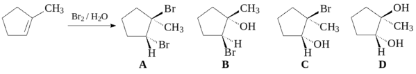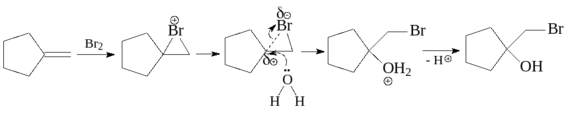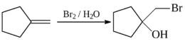 5555. Присоединение бромной воды к метиленциклопентану – пример реакции электрофильного присоединения к двойной связи с участием “внешнего” нуклеофильного реагента. Эта реакция носит название реакции “сопряженного” присоединения. Результаты этой реакции подтверждают несинхронный механизм присоединения брома. В реакции “сопряженного” присоединения с участием несимметричного алкена галоген всегда присоединяется к атому углерода, содержащему наибольшее количество атомов водорода, а нуклеофильный реагент (вода) – к атому углерода с меньшим числом атомов водорода.