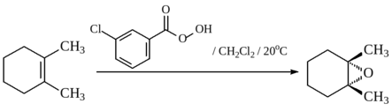 64. Это реакция эпоксидирования алкенов. Окислителем является мета-хлорнадбензойная кислота (MCPBA). Это кристаллическое соединение, стабильное в нормальных условиях. Эпоксидирование является синхронным согласованным процессом. Продукт реакции – эпоксид (оксиран) – образуется с сохранением конфигурации при атомах углерода кратной связи.