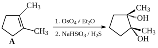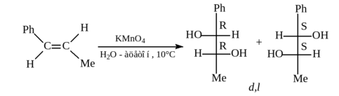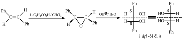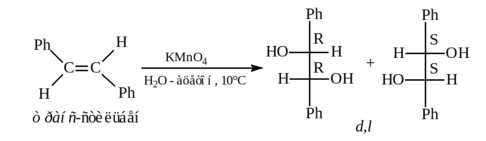 6868. Для превращения транс-1,2-дифенилэтилена (транс-стильбена) в мезо-1,2-дифенилэтандиол-1,2 можно использовать взаимодействие с KMnO4 или с OsO4. d,l-1,2-Дифенилэтандиол-1,2 получают реакцией транс-1,2-дифенилэтилена с мета-хлорнадбензойной кислотой или другими надкислотами c последующей обработкой водной щелочью.