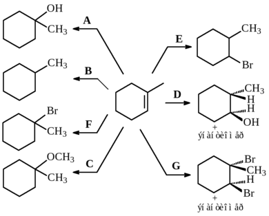 58. В реакции 1-метилциклопентена с бромной водой не образуется соединение D. Электрофилом в этой реакции является Br+. Нуклеофилами являются Br- и вода.