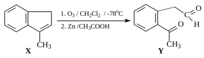 73. Соединение Y (C10Н10О2), в спектре ЯМР 1Н которого найдены синглет с 2.50 м. д. (3Н, СН3), дублет с 4.18 м. д. (2Н, СН2), мультиплеты ароматических протонов с 7.24, 7.29, 7.60 и 7.88 м. д. и триплет с 9.68 м. д. (1Н, С(О)Н), является (2-ацетилфенил)ацетальдегидом. Оно получено озонолизом 3-метил-1Н-индена (X) c последующим восстановительным разложением озонида.