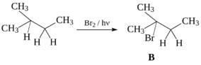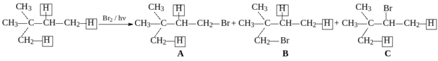 3333. Главным соединением в реакции 2-метилбутана с бромом в присутствии света или при нагревании является бромид В. Из-за не очень высокой реакционной способности брома реакция бромирования является селективной: преимущественно образуется алкилбромид за счет замещения по самой активной (реакционноспособной) связи C–H.