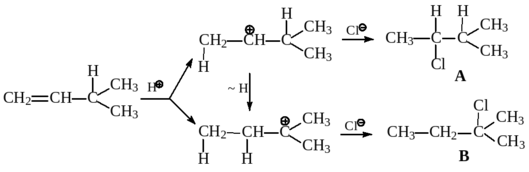 6363. Схема образования продуктов А (продукт нормального присоединения) и B (продукт перегруппировки) в реакции 3-метилбут-1-ена с газообразным HCl. В спектре ЯМР 1Н соединения B обнаружены триплет с 1.05 м. д. (СН3), синглет с 1.5 м. д. ((СН3)2С) и квадруплет с 1.75 м. д. (СН2). В спектре ЯМР 1Н соединения А должно быть четыре сигнала с соотношением интенсивностей 6 : 3 : 1 :1.