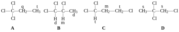 4141. Соединение C3H5Cl3, которое содержит в спектре ЯМР 1Н дублет с 1.70 м. д. (3Н), мультиплет с 4.32 м. д. (1Н) и дублет с 5.85 м. д. (1Н), имеет структуру В.