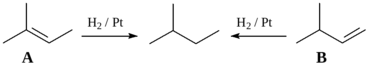 111111. Соединение В имеет более высокую теплоту гидрирования, так как 1,3-диен более стабилен.