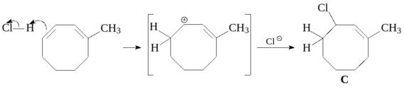 2) Присоединение может проходить по менее замещенной двойной связи С(3)-С(4), приводя к вторичному карбокатиону. Присоединение нуклеофила к этому карбокатиону дает продукт 1,2-присоединения.