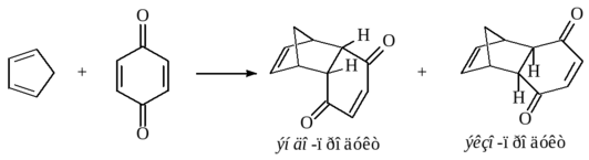 119119. Реакция Дильса-Альдера является синхронной (все связи образуются одновременно) и протекает стереоспецифично как цис-присоединение к двойной связи, т. е. конфигурации диена и диенофила сохраняются при образовании аддукта. В ходе реакции образуются 2 новые -связи и одна -связь.