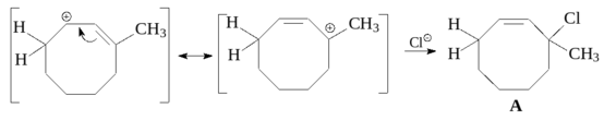 3) Присоединение может проходить по менее замещенной двойной связи С(3)-С(4), приводя к вторичному карбокатиону. Резонансная форма этого катиона является более стабильным третичным и аллильным катионом. Присоединение нуклеофила к этому карбокатиону затем дает продукт 1,4-присоединения.