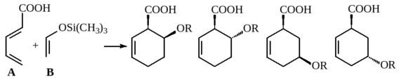 124124. В реакции Дильса-Альдера диена A и диенофила B должно получиться (не учитывая энантиомеров) четыре изомерных циклогексена.