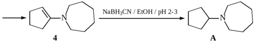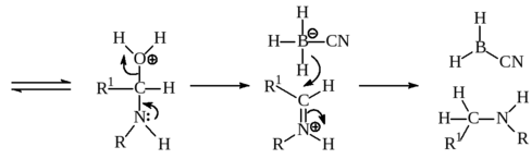 Реакция восстановительного аминирования карбонильного соединения. Полагают, что интермедиатами в такой реакции являются имины (основания Шиффа).