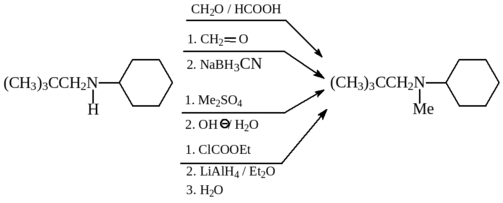 Реакция Эшвайлера-Кларка, а также ее частный случай – реакция Лейкарта-Валлаха – относятся к реакциям восстановительного алкилирования аминов альдегидами и кетонами (восстановителем здесь является муравьиная кислота).