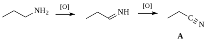 Последовательность окисления первичного амина аналогична окислению первичного спирта до альдегида и далее альдегида – до карбоновой кислоты. Сначала дегидрирование дает имин, который при дальнейшем окислении превращается в нитрил А.