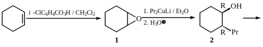 38. Получение N-изопропил-2-пропилциклогексанамина (А) с цис-расположением амино- и пропильной групп (смесь энантиомеров) из циклогексена, ацетона и других необходимых реагентов: синтез окиси циклогексена 1 реакцией Прилежаева, раскрытие оксиранового цикла дипропилкупратом лития с образованием спирта 2 в виде смеси энантиомеров и его тозилата 3 (сохранение конфигурации при атоме С-1), нуклеофильное SN2 замещение OTs группы на азидо-группу (обращение конфигурации при атоме С-1), восстановление азида 4 до амина 5 (сохранение конфигурации при атоме С-1), восстановительное аминирование ацетона (сохранение конфигурации при атоме С-1).