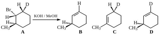 46. Какой из циклогексенов B, C или D образуется в качестве основного продукта. при обработке метилатом натрия дейтерированного бромциклогексана А. Ответ аргументируйте с использованием конформационных формул в форме кресла (конформационный анализ). Изобразите стереохимию переходного состояния реакции.