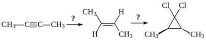 7. Напишите схему синтеза циклопропана А из диазометана, уксусной кислоты и необходимого изомерного 2-бутена. Используйте реакцию циклопропанирования ([1+2]-циклоприсоединения) с участием диазокетона.