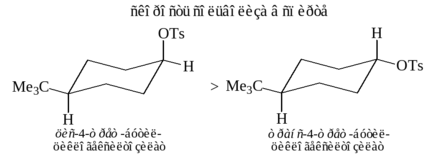50. Известно, что цис-4-трет-бутилциклогексилтозилат подвергается алкоголизу в 4 раза быстрее, чем соответствующий транс-изомер. Дайте объяснение этому факту.