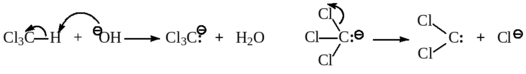 Карбены – нейтральные молекулы, в которых один из атомов углерода имеет шесть электронов. Этот углерод двухвалентен. Карбены слишком активны, чтобы быть выделенными и храниться, но они могут быть изучены спектральными методами при низкой температуре. Процесс образования синглетного дихлоркарбена из хлороформа относится к гем-элиминированию, в котором атомы водорода и хлора отщепляются от одного атома углерода. Это -элиминирование протекает через интермедиат K+ [:CCl3]-