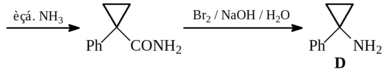 Синтез (1-фенилциклопропил)амина (D) с аминогруппой при третичном атоме углерода из циклопропана С осуществляется с использованием перегруппировки Гофмана.