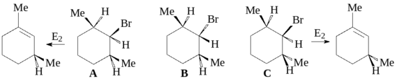 52. Из трех возможных стереоизомеров 2-бром-1,3-диметилциклогексана (А–С) элиминированию под действием EtONa / EtOH не будет подвергаться стереоизомер В, так как расположение атомов водорода и брома в его обеих возможных конформациях не отвечает стереоэлектронным требованиям Е2-элиминирования.