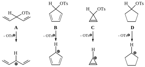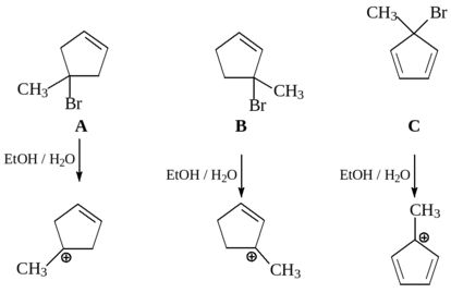 Ионизация соединения С должна давать неустойчивый карбокатион с «анти-ароматическими» свойствами, поскольку он содержит циклическую систему с четырьмя электронами. Самым стабильным является третичный аллильный карбокатион из бромида В.