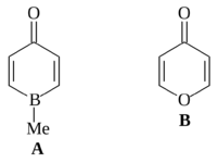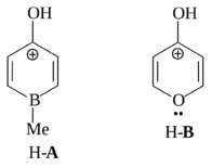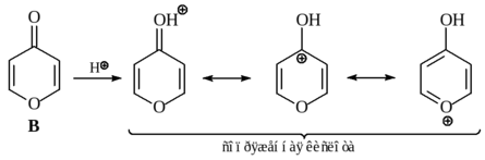 Протонированная форма соединения А имеет 4 электрона и поэтому неустойчива, а протонированная форма соединения B (-пирона) – 6 электронов – и представляет собой ароматическое соединение. Следовательно, А – более основен вследствие меньшей устойчивости сопряженной кислоты.