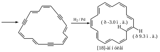 Ароматическая структура: (4n+2), n = 4, 18 электронов. Размер кольца [18]-аннулена достаточен, чтобы быть плоским без стерических препятствий внутренних протонов.