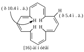 Спектр ЯМР 1Н [16]-аннулена изменяется с температурой: при -110°С в нем видны сигналы внутренних протонов с 10,43 м. д. (4Н) и внешних протонов с 5.4 м. д (12 Н), которые при нагревании образца до 30°С сливаются в синглет с 6,7 м. д. Очевидно, здесь происходят те же процессы, что и в ряду (4n+2)-аннуленов, следствием чего является обмен внешних и внутренних протонов. Однако в низкотемпературном спектре в сильном поле оказываются внешние протоны, а в слабом поле – внутренние. Таким образом, [16]аннулен является паратропной системой. Рентгеновский кристаллографический анализ показывает, что молекула содержит альтернирующие (чередующиеся) простые и двойные связи и молекула непланарна, хотя отклонение от планарности невелико.