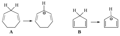 13. Из двух соединений – циклогепта-1,4-диен (A) и циклопента-1,3-диен (В) – более сильной кислотой является циклопента-1,3-диен (В), поскольку сопряженное ему основание – циклопента-1,3-диенил-анион, являясь ароматическим соединением, более стабильно, чем основание, сопряженное циклогепта-1,4-диену (A).