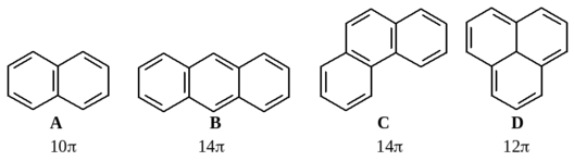 5. Из приведенных ниже соединений критерию ароматичности Хюккеля удовлетворяют А (нафталин), В (антрацен) и С (фенантрен).