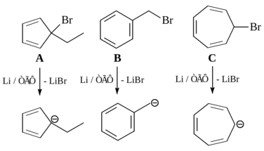 10. Два из приведенных в задании соединений дают ароматический анион. Депротонирование циклопента-1,3-диена генерирует резонансно стабилизированный анион, который содержит 6 электронов. Металлирование бензола приводит к образованию фениллития, который также сохраняет неизменным ароматический фрагмент.