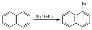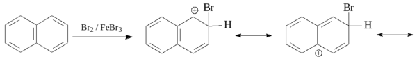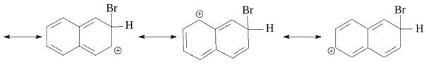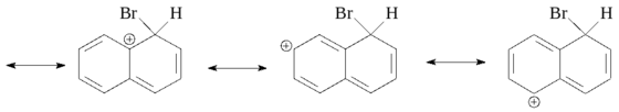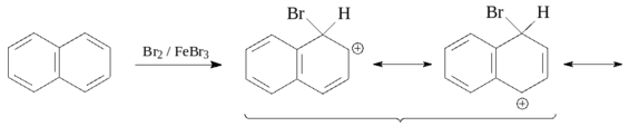 Для замещения по С-1 и по С-2 атомам нафталина существует одинаковое число резонансных структур. Однако, в случае замещения по С-1 есть две структуры с сохранением ароматического кольца, а для С-2 – только одна. Следовательно, быстрее будет протекать реакция, которая имеет энергетически более эффективное переходное состояние, т. е. реакция, приводящая к 1-бромнафталину.