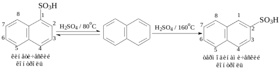 54. Структуры соединений, получающихся при действии серной кислоты на нафталин: а) при 80оС (нафталин-1-сульфокислота) и б) 160 оС (нафталин-2-сульфокислота). Нафталин-1-сульфокислота образуется легче, поскольку карбокатион (-комплекс), приводящий к его образованию более стабилен (мягкие условия, кинетический контроль). 2-Замещенный продукт (нафталин-2-сульфокислота) является более стабильным, поскольку в нем больше пространства для объемной сульфогруппы во 2-ом положении. Он образуется в более жестких условиях (термодинамический контроль).