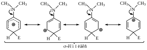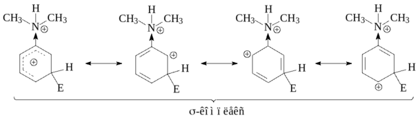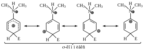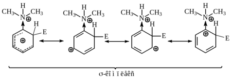 Наиболее сильная дезактивация должна наблюдаться для замещения в орто,пара-положения, так как в наборе резонансных структур в том и в другом случае есть чрезвычайно невыгодные структуры, содержащие положительно заряженные соседние атомы углерода и азота.