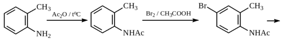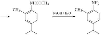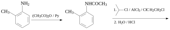 61. Синтез 1-амино-2-метил-4-изопропилбензола, исходя из орто-толуидина (2-метиланилина). Прямое алкилирование орто-толуидина приводит к смеси соединений. Поэтому в этом случае, как и в ряде других реакций электрофильного замещения с участием анилина, сначала получают ацетанилиды, а в завершающей стадии ацетильную защиту снимают.
