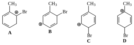 56. Из структур A–D не может рассматриваться при обсуждении реакции бромирования толуола структура А. Когда Br+ образует связь с кольцом, положительный заряд переходит на соседний атом, но не на атом, связанный с Br.