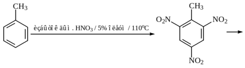 45. Прямое нитрование бензола до 1,3,5-тринитробензола протекает с очень низким выходом (3-5%) из-за деактивирующего влияния нитрогрупп. Поэтому его синтез лучше проводить в три стадии исходя из толуола. Толуол легко нитруется с образованием 2,4,6-тринитротолуола. При его последующем окислении легко образуется 1,3,5-тринитробензойная кислот, декарбоксилирование которой дает 1,3,5-тринитробензол.