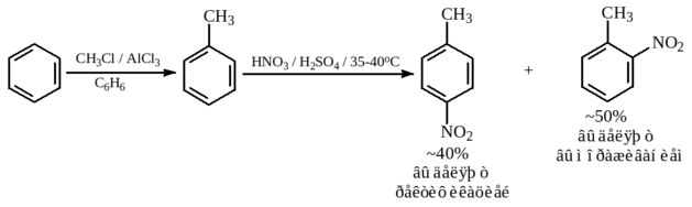 60. Путь синтеза 2-бром-4-нитротолуола из бензола. Для получения толуола из бензола реакцией алкилирования Фриделя-Крафтса нужно использовать большой избыток бензола, чтобы избежать реакции полиалкилирования.