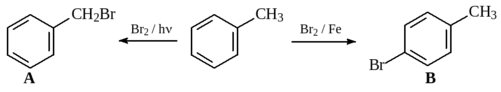 51. Соединение А является продуктом радикальной реакции, а соединение В – результат реакции ароматического электрофильного замещения.