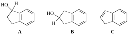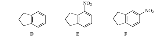 47. Два бициклических спирта А (С9Н10О, оптически активный) и В (С9Н10О, оптически неактивный) реагируют с серной кислотой, давая в результате дегидратации один и тот же углеводород С. Его каталитическое гидрирование (Н2 / Pd-C / EtOH) приводит к углеводороду D (С9Н10), который дает только два продукта мононитрования (Е и F) при действии HNO3 / H2SO4.