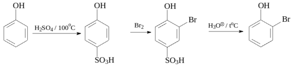 52. Последовательность превращений, позволяющая получить преимущественно орто-бромфенол. Объемная сульфогруппа входит в пара-положение. Группы -OH и -SO3H согласованно ориентируют вступление брома в орто-положение к гидроксильной группе.