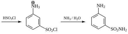 49. На первой стадии аминогруппа протонируется в сильно кислых условиях. Образующаяся аммониевая группа является мета-ориентантом, так что конечный продукт будет мета-изомером целевого сульфаниламида.