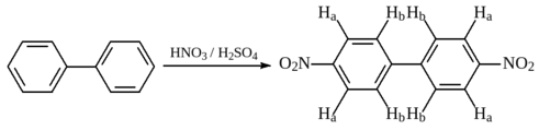 46. При обработке бифенила двумя эквивалентами нитрующей смеси проходит нитрование в положения 4 и 4’, что следует из данных спектра ЯМР 1Н, в котором найдены два дублета попарно эквивалентных протонов с 7.77 (4Н, Нв) м. д. и 8.26 (4Н, На) м. д..