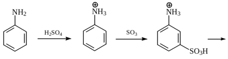 Сопоставимое взаимодействие не происходит с анилином, так как аминогруппа протонируется в сильно кислых условиях реакции нитрования и основным продуктом является мета-нитропроизводное.