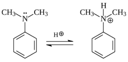 Несмотря на невысокую кислотность, аммонийная соль находится в равновесии со свободным основанием, которое быстро реагирует с нитроний катионом, образуя преимущественно пара-изомер нитродиметиланилина (~11%).