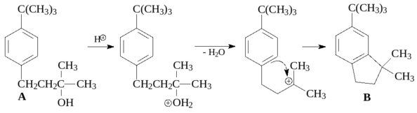 62. Схема механизма превращения соединения А в соединение В включает внутримолекулярное алкилирование бензольного кольца по Фриделю-Крафтсу промежуточным карбокатионом.