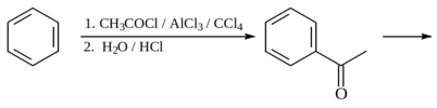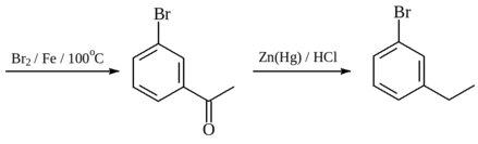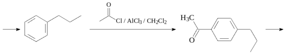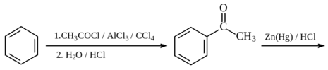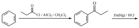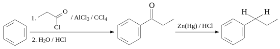 67. Для синтеза пропилбензола нельзя использовать взаимодействие бензола с 1-хлорпропаном из-за побочных процессов, обычно сопровождающих реакцию алкилирования – изомеризация и полиалкилирование. Поэтому сначала реакцией ацилирования по Фриделю-Крафтсу сначала получают этилфенилкетон. Далее карбонильную группу восстанавливают в условиях реакции Клеменсена.