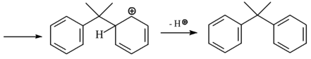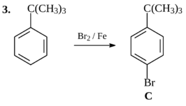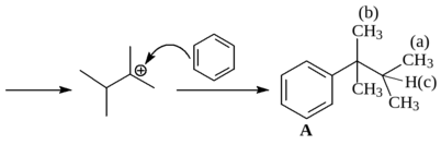 65. В результате алкилирования бензола 2,3-диметил-1-хлорбутаном был получен (1,1,2-триметилпропил)бензол (А). Спектр ЯМР 1Н (, м. д., CDC13): 0.75 (дублет, 6Ha), 1.22 (синглет, 6Hb), 1.92 (септет, 1Hc), 7.0-7.4 (мультиплет, 5H, ароматические протоны). Схема образования соединения А включает перегруппировку первичного карбокатиона в третичный карбокатион.