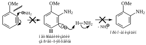 Анион I образуется предпочтительно, поскольку рядом находится электроноакцепторная метокси-группа (–I-эффект). Кстати, этот же фактор способствует депротонированию исходного бромпроизводного с образованием соответствующего дегидробензола. Алкокси-группа является здесь электроноакцепторной группой (не проявляет +М-эффект), так как анион образуется в плоскости бензольного кольца и не может участвовать в сопряжении с орбиталями бензола.