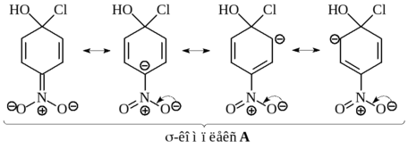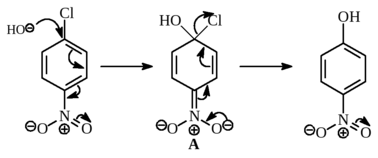 83. Получение пара-нитрофенола нагреванием пара-хлорнитробензола с 10-15% водным раствором NaOH при 150-190оС под давлением протекает по механизму присоединение–элиминирование (SNAr). Этот механизм характерен для аренов, активированных к нуклеофильному замещению за счет наличия в орто- и пара-положениях к уходящей группе заместителей с –М-эффектом. Этот тип нуклеофильного замещения в определенной степени сходен с механизмом SN2 в алифатическом ряду: оно, как правило, протекает также бимолекулярно и самой медленной стадией является образование аниона А. Однако анион А представляет собой не переходное состояние, а является промежуточным соединением.